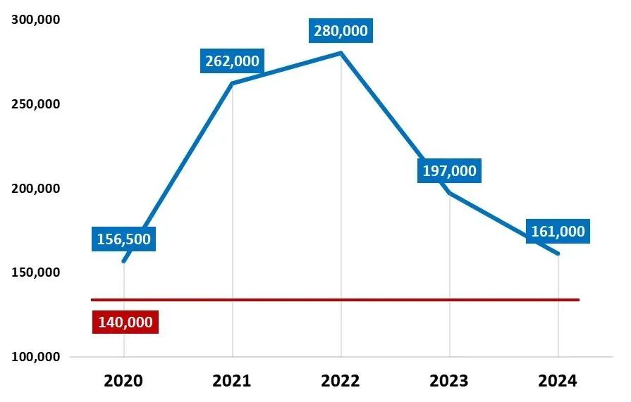 从2020财年到2024财年的数据中,职业移民配额呈现出一定的波动。2020财年的配额为156,500张,2021财年增加至262,000张,2022财年进一步增至280,000张。