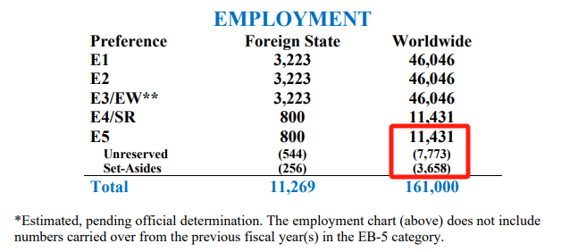 大家比较关心的2024年EB-5签证配额共计11,431 张,预留签证配额约3,658张、非预留签证配额约7,773张。而EB-5的亲属移民预留签证名额约是4478张。
