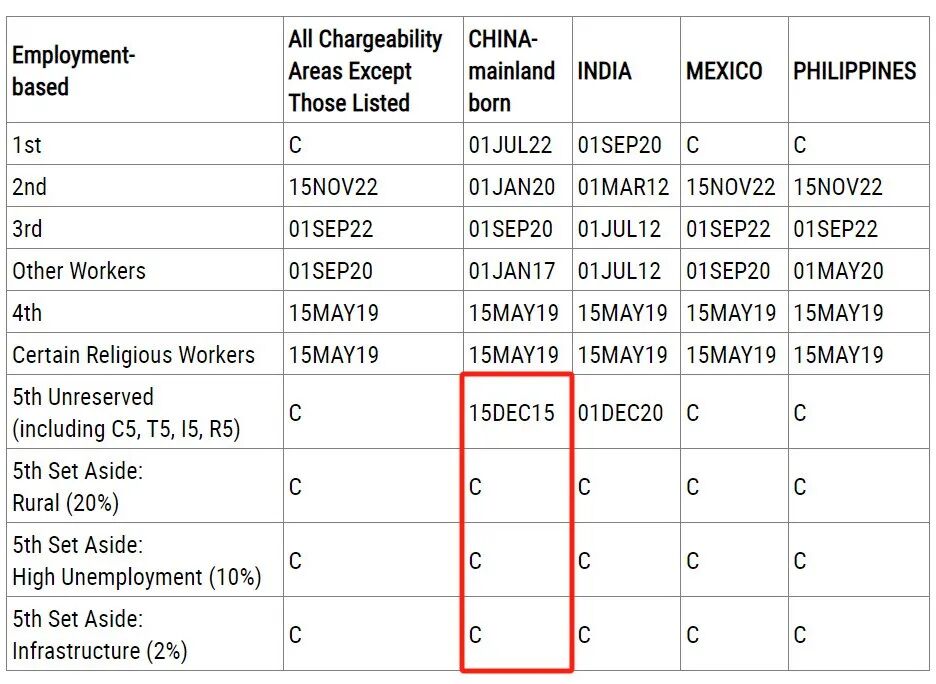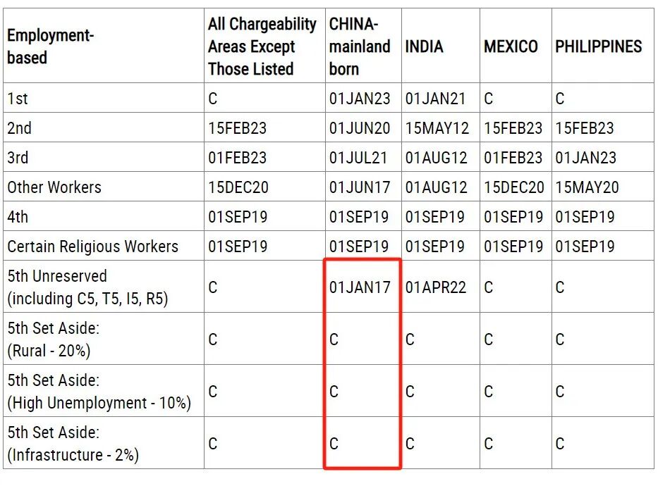 表B中,签证预留类别为:C,无排期;非签证预留类别依旧维持在2017年1月1日。